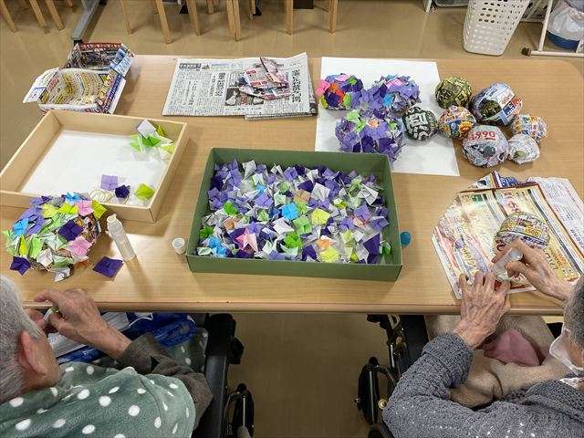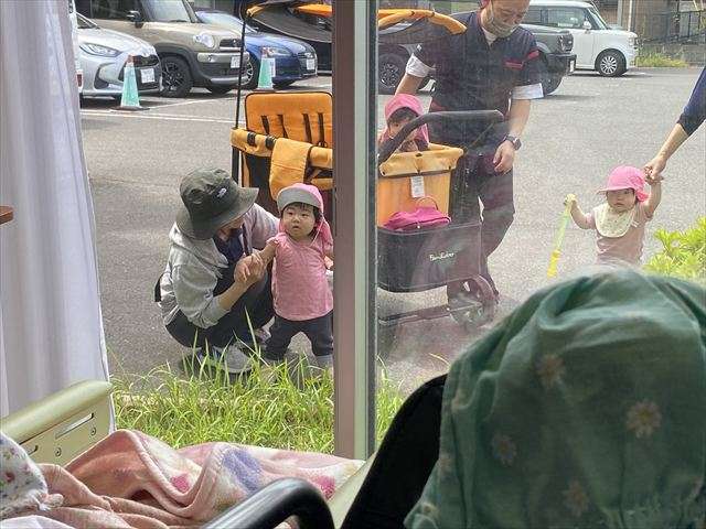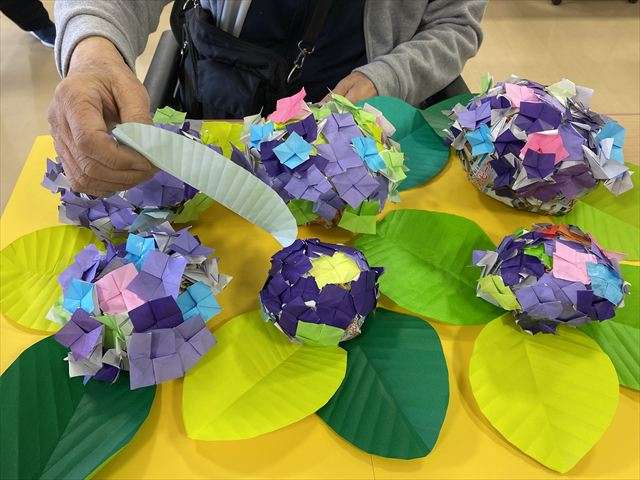 子ども達に笑顔&紫陽花作り 2025/05/17 子どもたちに笑顔 南側のカーテンを開けると、桃色帽子を被った子どもたちが、シャボン玉を追いかけていました。気付いた子どもと先生が駆け寄ってきました。「可愛いね~」「小さいのにあんよが上手」と皆さんの目尻がすっかり垂れ下がっていました。 紫陽花作り 沢山の小さな花を作り、花を一つ一つ丁寧に丸い土台に貼り付けていきます。するとなんと綺麗な紫陽花の出来上がりです! スタッフ日記