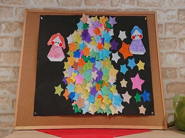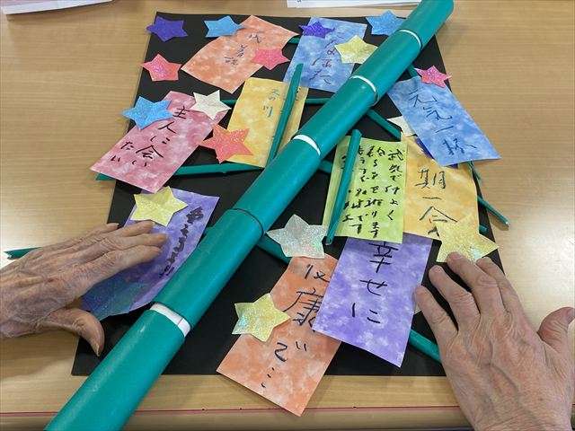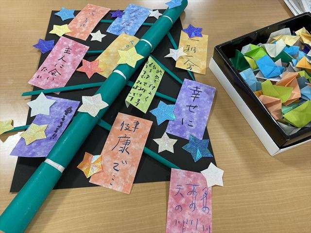 壁面飾り”七夕” 2025/06/20 七夕飾り 七夕飾り作り 短冊に思い思いの願いを書き、七夕飾りを作りました。 今年の夜空はお天気になるでしょうか?願いを込めて作りました。 アネックスの壁飾り 天の川 スタッフ日記