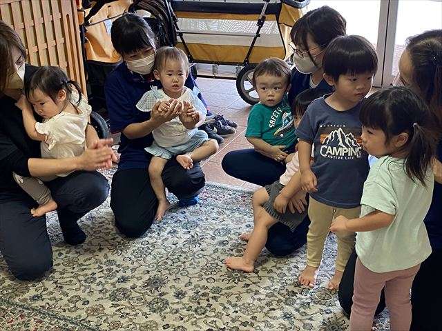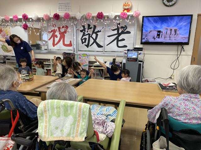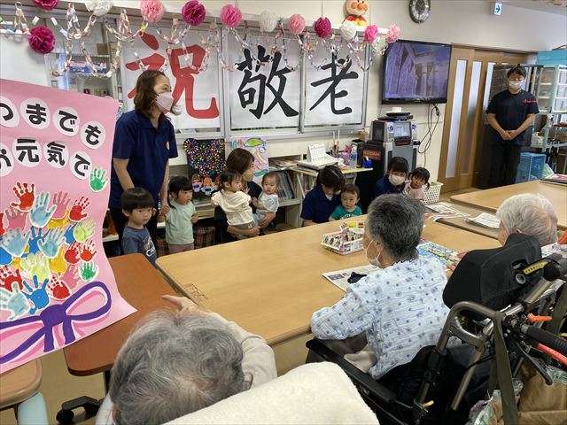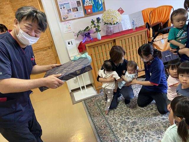 敬老の日 子どもたちからのプレゼント 2025/09/16 素敵な花束 レインボー恵保育園の子どもたちより、敬老の日に可愛らしいプレゼントを頂きました。小さなお手々の大きな花束です。保育園の全員の子ども達の力作に皆さん目を潤ませ「ありがとう」「長生きするね」ととても嬉しそうでした。 トンボのメガネの歌と花束のプレゼント 可愛らしい声でトンボのメガネを歌って踊ってくれ、皆さんホカホカの温かい時間を過ごすことが出来ました。またいつでも遊びに来てね! 社長の〇〇回目のお誕生日 子どもたちからハッピーバースデイ♪ 終始笑顔の田村社長。 スタッフ日記
