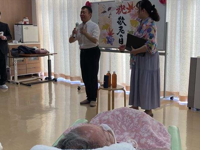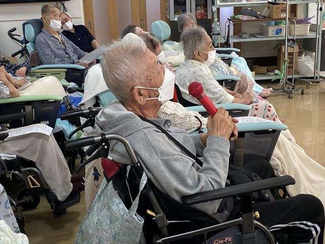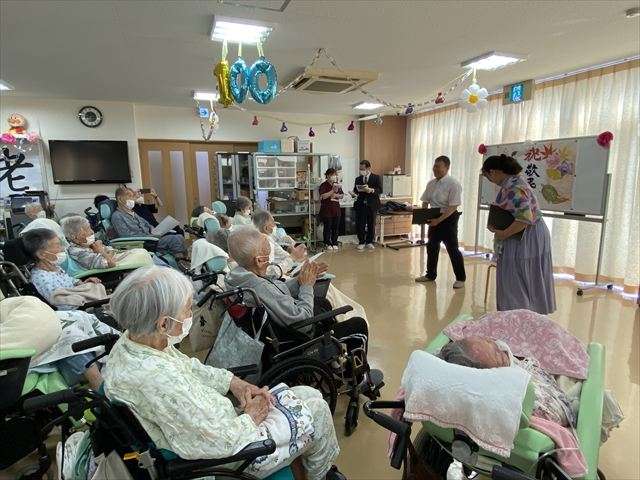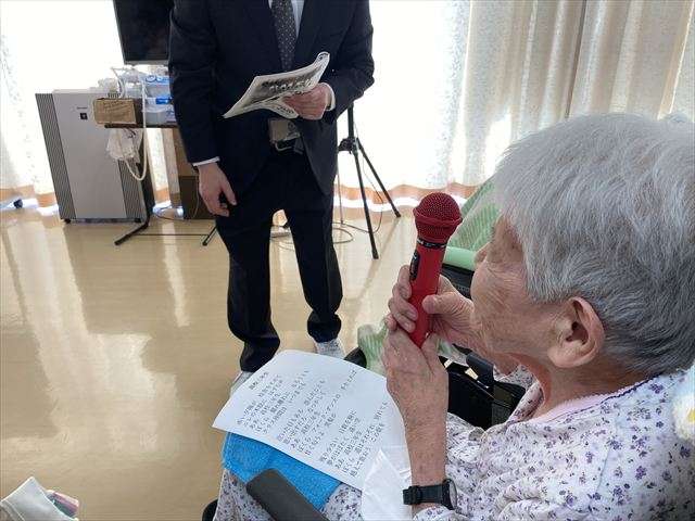 敬老会~東京混声合唱団の方による生歌披露~ 2025/09/12 敬老会 今年の敬老会は、なんと東京混声合唱団の方が来てくださり、 思い出の歌を皆さまに披露してくださいました。ご夫婦で歌う歌は、息もピッタリ。何よりも心地よいコーラスに、皆さんはもちろん、私たち職員もなんだか優雅な気持ちになりました。 アンコールで披露して頂いた「ふるさと」は、皆さんも職員も一緒に歌い、歌いながら涙ぐむかたもいて心温まる時間となりました。 とても素敵な歌のプレゼントを頂き、大変ありがとうございました。 感動の時間をありがとうございます! 歌を披露して頂き、ぜひお礼が言いたいとお礼の言葉を伝えてくださいました。ぜひまたレインボー恵に来てください。お待ちしています。 おやつにお手製芋ようかん 抹茶入り緑茶と芋ようかんは最高に美味しかったです。「おご馳走さまでした」 スタッフ日記