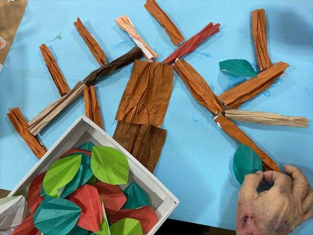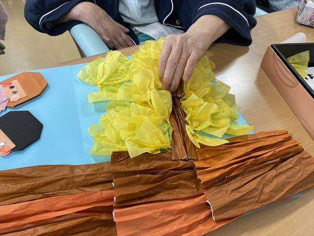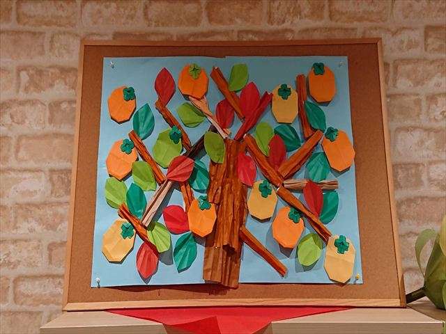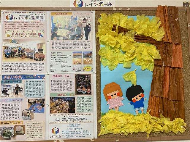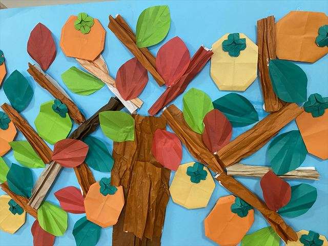 壁面飾り~銀杏・柿編~ 2025/11/05 壁面飾り~銀杏編~ 黄色いじゅうたん いつもご視聴ありがとうございます。 11月に入り、レインボー恵近くのレインボー通りやサンシャイン通りの街路樹も赤く紅葉が始まっています。今年は秋を感じたのが10月も後半に入ってからでした。秋祭りも終わり、少しずつ朝晩の気温も下がり始め、いい感じに色付き始めています。 恵の玄関は、すっかりと銀杏が黄色く色付き、沢山の落ち葉で黄色いじゅうたんが出来上がっています。是非、お越しの節はご覧ください。 壁面飾り~柿編~ アネックスにはたわわに実った柿の壁面を飾っています。 是非、お越しの際はご覧ください。 壁面飾り作り 今年の秋は太陽をいっぱい浴びた甘い果物や、山々の紅葉も大変楽しみですね。 スタッフ日記