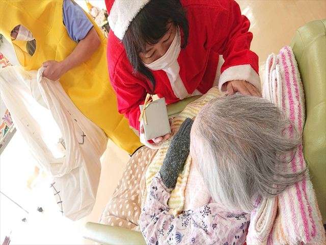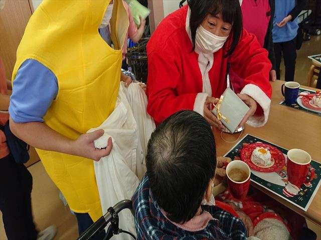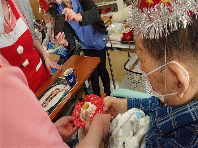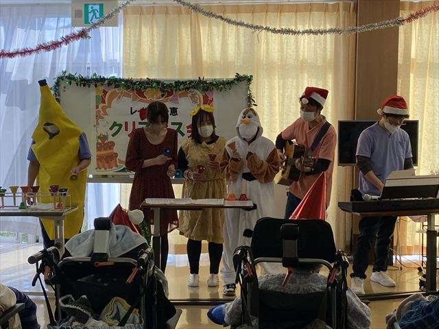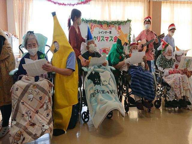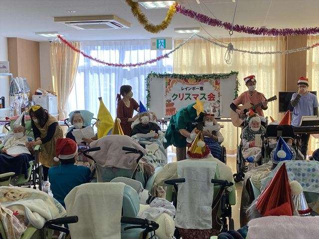 2025レインボー恵クリスマス会 2025/12/18 サンタクロースがやってきた! 2025クリスマス会開催 「今から2025レインボー恵クリスマス会を開催します!」サンタクロースの一声で クリスマス会がスタートしました。 チョコボール&有志によるハンドベル演奏 今年は利用者様にも参加して頂き、一緒に演奏するスタイルでジングルベルを演奏しました。皆さん担当の音の順番がくるとドキドキしながらもハンドベルをふって音を楽しみました。二曲目は職員によるきよしこの夜…なんだかグダグダのきよしこの夜(笑)お腹抱えて笑ている方もいらっしゃるほど楽しい演奏でした。 クリスマスプレゼント 「メリークリスマス!」施設長扮したサンタクロースより、プレゼントをお渡ししました。トナカイと一緒ではなく謎のバナナの付き添いで(笑)「ありがとう」と笑顔が見られていました。 職員手作りのクリスマスケーキ スタッフ日記