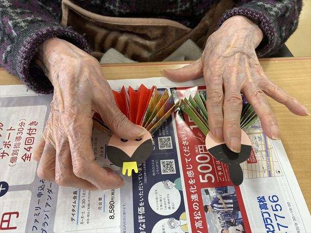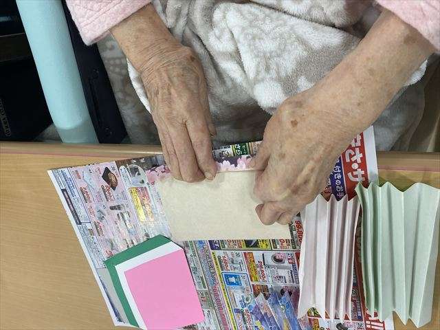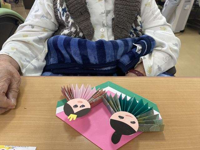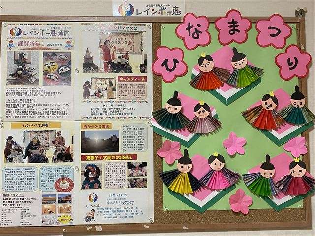 雛飾り 2026/02/15 恵のお雛さま 今年もレインボー恵の玄関には、お雛さまを飾っています。デイサービスに来られた際、玄関のお雛さまを見て「もうお雛様なの?」「綺麗ね」と眺めています。 3月3日までの期間限定。是非、お越しの際はご覧ください。 お雛さまの壁面飾り 和柄の折り紙をジャバラに折って着物を作り、顔を書いて着物を着せてお手製のお雛さまを作成しました。お顔も着物も違って可愛らしいお雛さまの完成です。 お雛さま作り 一つ一つ丁寧に折り紙を折り着物を作ります。お顔のパーツに目と鼻と口を書き、台紙に貼り付け出来上がりです。 スタッフ日記